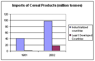 Food trade has grown considerably in the past 40 years. To take trade in cereal products as an example, industrialised countries have tripled their exports while exports from the poorest countries have dropped by 40% from 2.8 million tonnes to 1.6 million tonnes. (see figure 9):