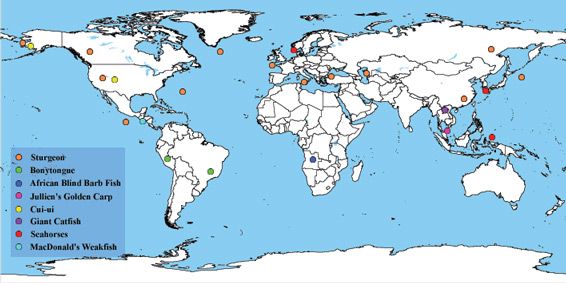 The map above exhibits the species of fish that are currently listed on the CITES (Convention on International Trade in Endangered Species) endangered species list. The different coloured dots correspond to the different fish species on the list and its associated habitats.