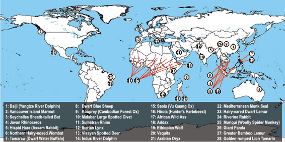 The above map shows critically endangered mammals numbering one thousand or less. Each number corresponds to a different type of mammal and where they live on the planet.