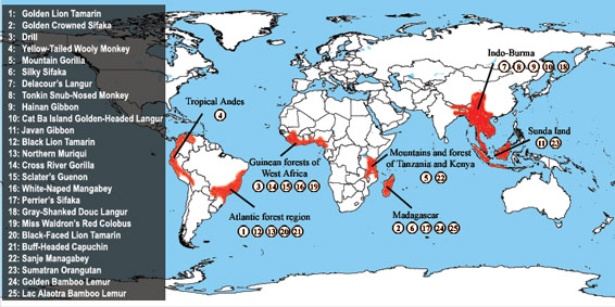 The above map indicates where all the endangered primates reside. Each number corresponds to a different species of primate.