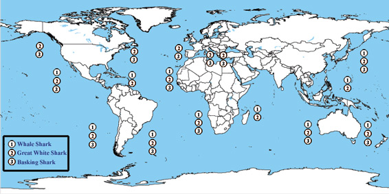 The map above shows the species of sharks that are currently listed on the CITES (Convention on International Trade in Endangered Species) endangered species list. The numbers correspond to the different shark species and where they can be found in the world.