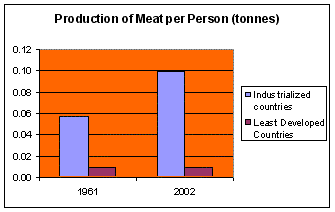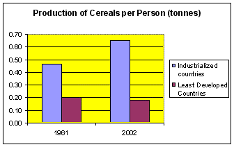 FAO statistics show that industrialised countries have much higher productivity in cereal crops: there are three times more cereal crops per head of population than in the poorest or least developed countries. The figures also show that the amount per person has fallen in the poorest countries. (see Figure 2):